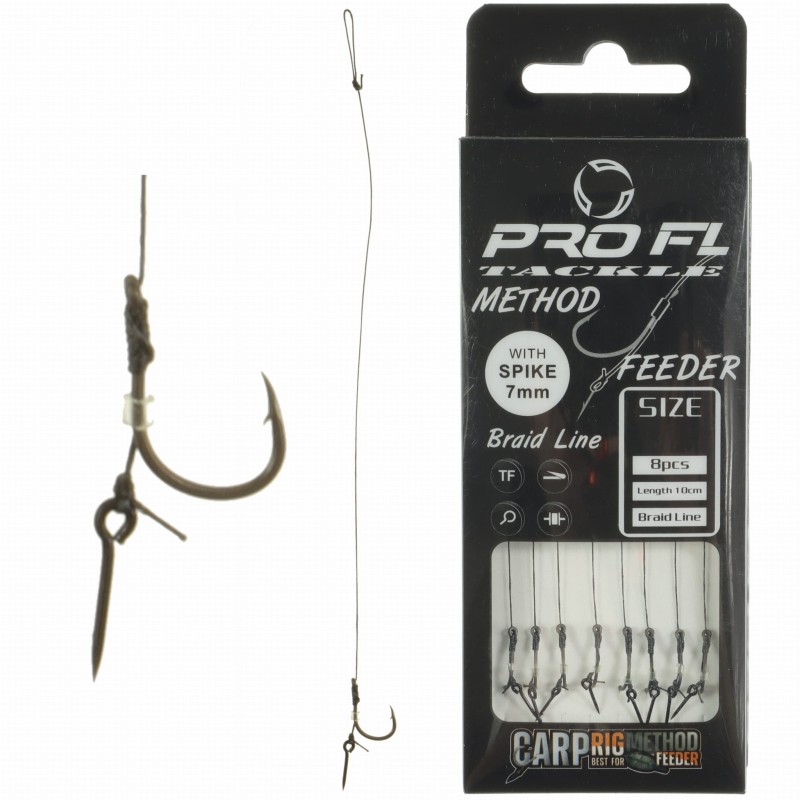 Zastosowane kute haki #6 pokryte powłoką teflonową zostały osadzone na plecionce o długości 10 cm z włosem zakończonym igiełką z zadziorami do nabijania pelletu, kukurydzy lub innych przynęt do Method Feeder.