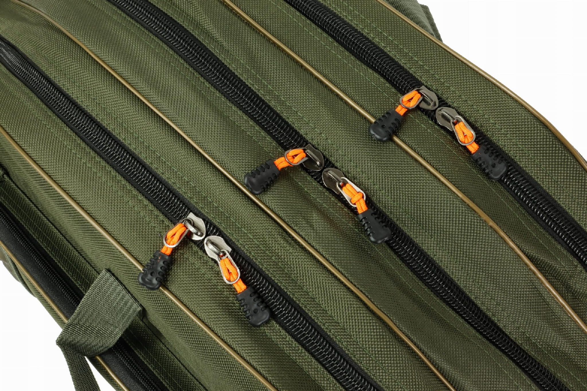 Wykonany z mocnego wodoodpornego materiału, wyposażony w solidne zamki błyskawiczne. Wygodny do transportu, gdyż posiada regulowaną szelkę umożliwiającą założenie go na ramię i dwa krótsze uchwyty do przenoszenia w ręku. Trzy niezależne, pojemne komory na wędziska z kołowrotkami, dwie mniejsze kieszonki na akcesoria sprawiają, że pokrowiec pomieści i uporządkuje w jednym miejscu sprzęt potrzebny do zabrania na łowisko.
