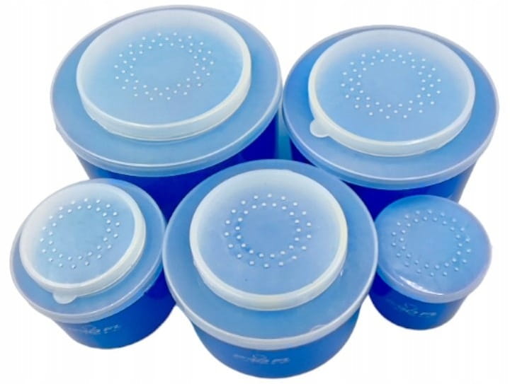 Pojemniki idealnie sprawdzą się do przetrzymywania żywych przynęt (posiadają otwory w wieczkach) oraz do odmierzania ilości zanęty, robaków czy gliny podczas zawodów wędkarskich i nie tylko.