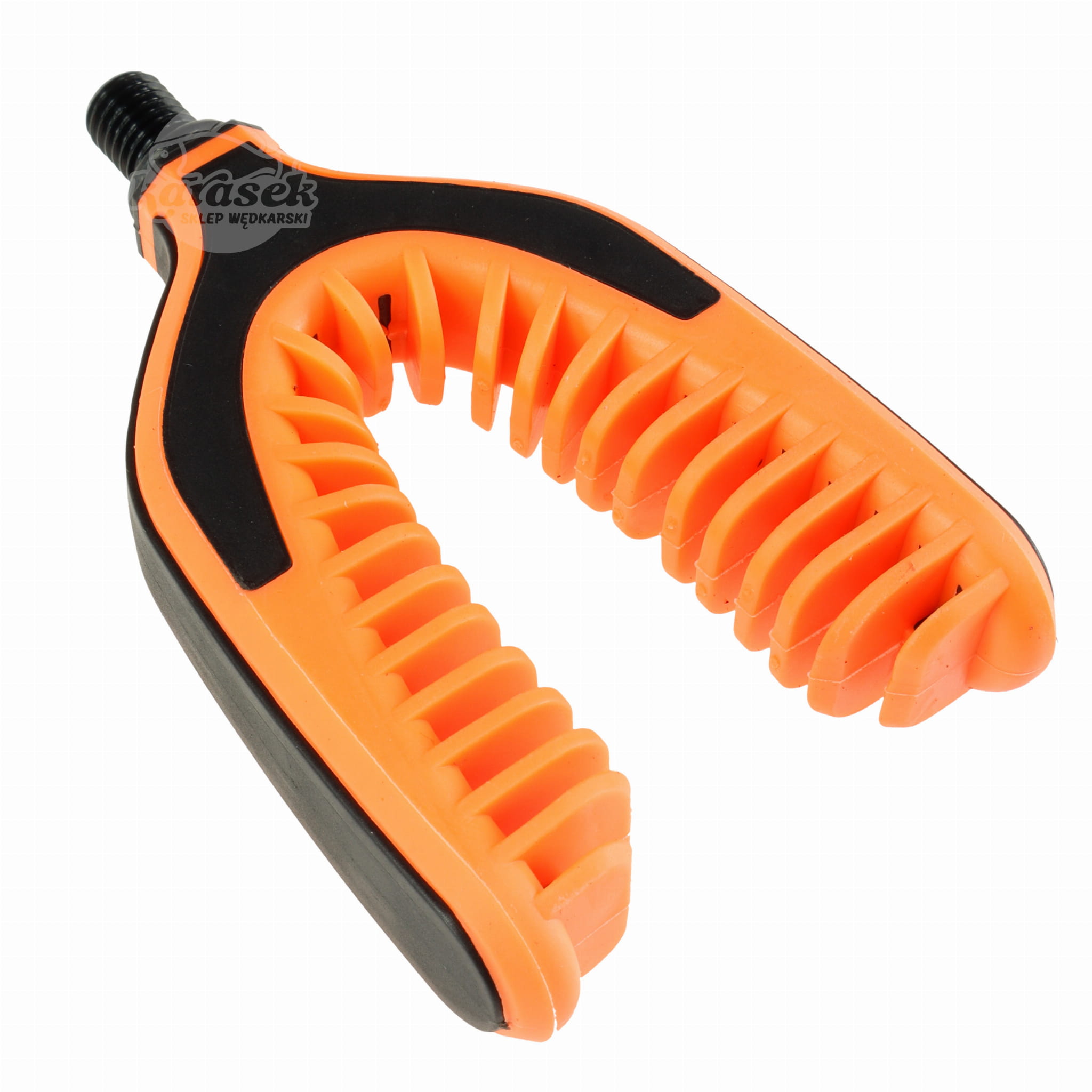 Wykonana z gumowanego tworzywa. Wyposażona w specjalne gumowe wypustki do chwytania dolnika wędziska. Dzięki swojej konstrukcji idealnie zabezpiecza wędzisko przed wciągnięciem do wody podczas agresywnego brania. Wyposażona w standardowy metalowy gwint z gumowym oringiem ułatwiającym regulację.