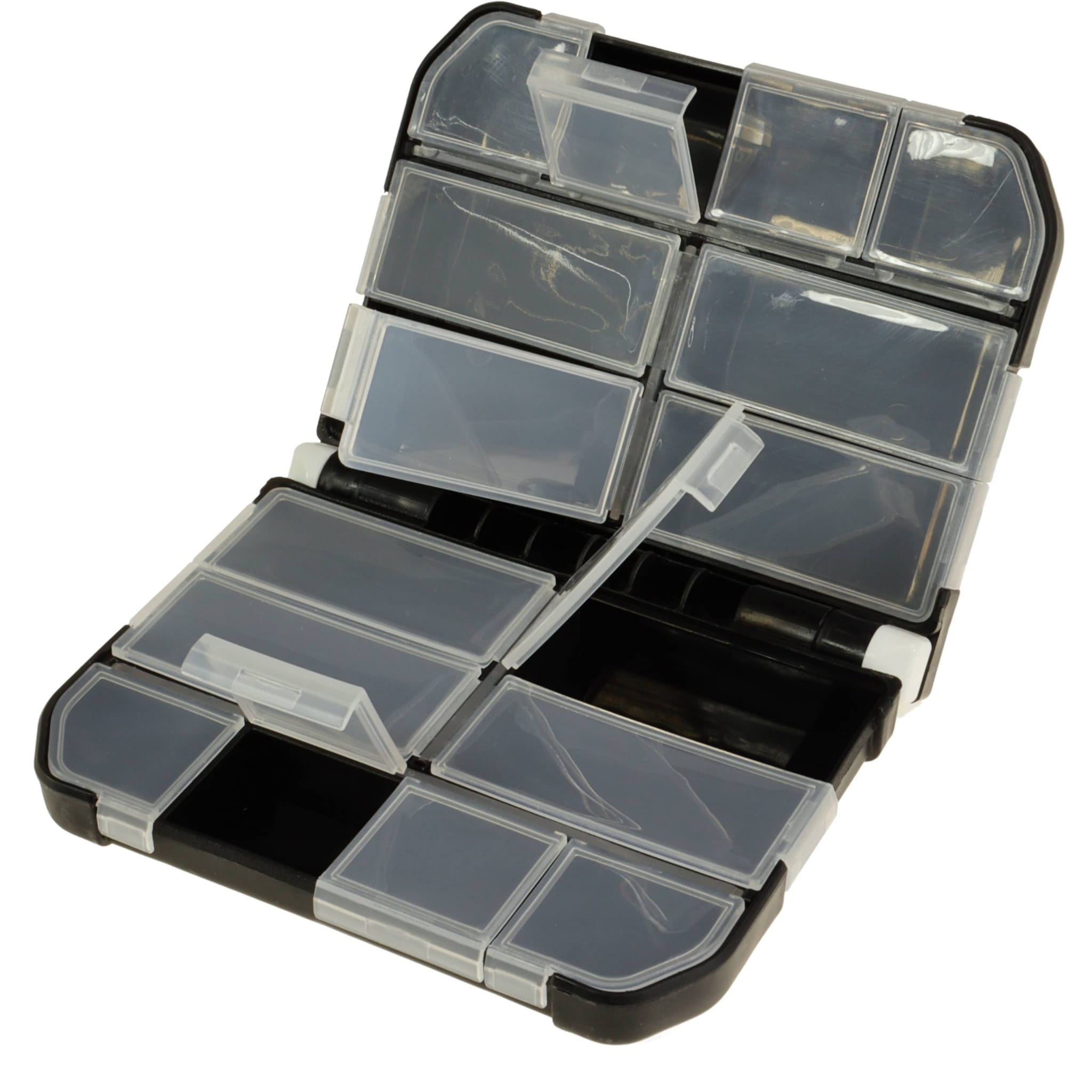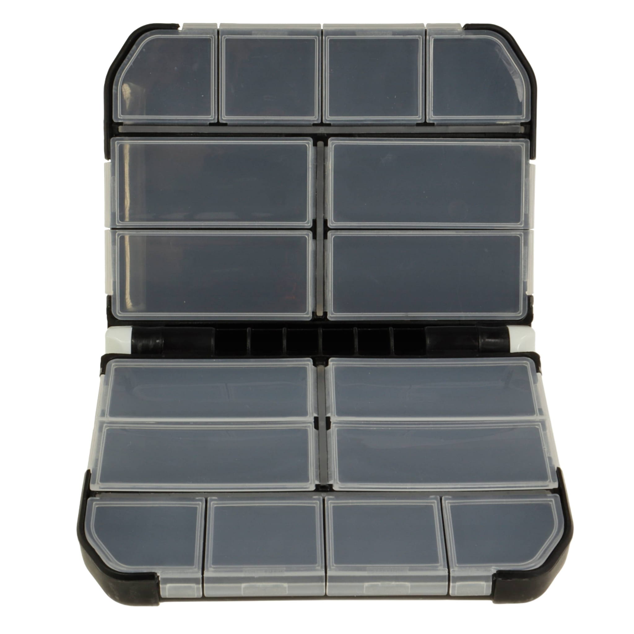 Uniwersalne, wielokomorowe pudełko, wykonane z wysokiej jakości materiałów, które umożliwia rozmieszczenie akcesoriów wędkarskich według indywidualnych potrzeb.
