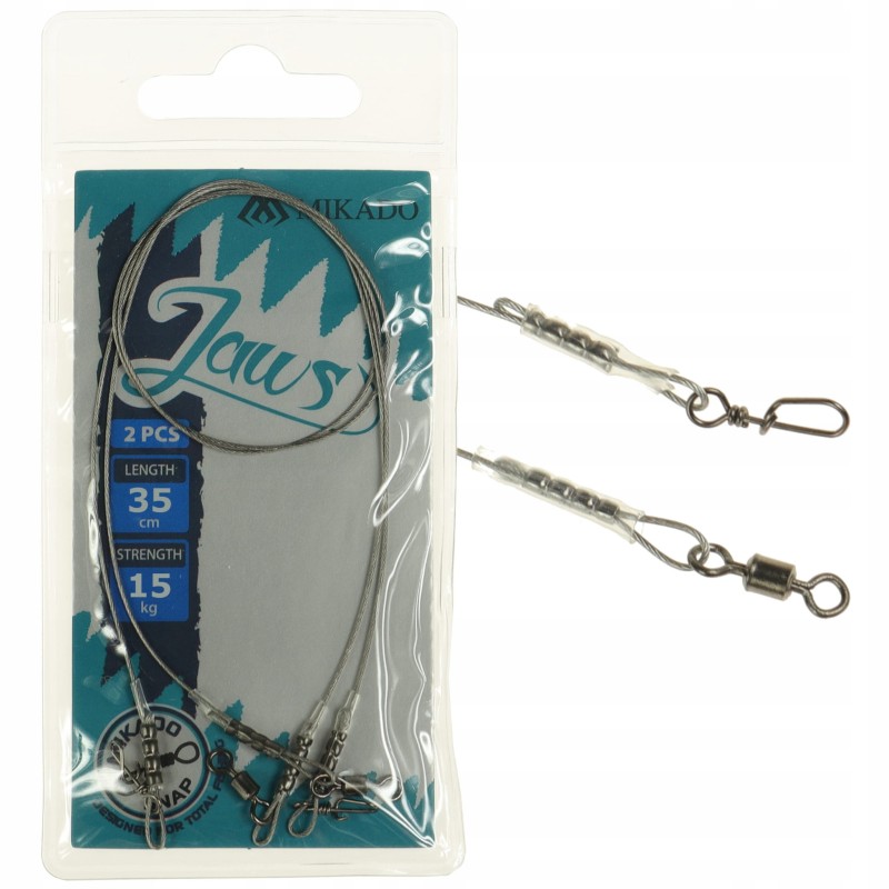 Przypony Jaws to najwyższej klasy stal nierdzewna w dodatkowej otulinie przeciwdziałającej skręcaniu się, zapleciona na niklowanych niezwykle wytrzymałych krętlikach rolkowych, wraz z agrafką szybkiej zmiany przynęty Quick Snap. Gwarantują pewny hol największych okazów "pokazujących swój pazur".