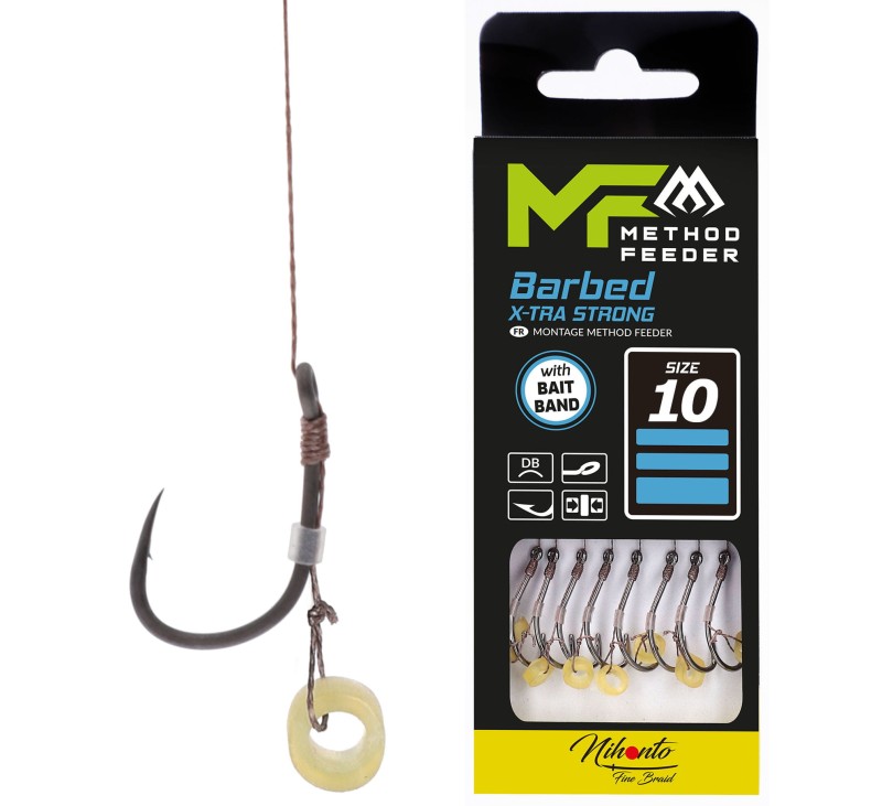 Najwyższej klasy przypony do łowienia na Method Feeder, czyli z podajnikiem zanętowym. Wyposażone w specjalną lateksową gumkę, zamontowaną na włosie. Dzięki czemu zakładanie przynęty, nigdy nie było prostsze. Wykończone piekielnie ostrym hakiem X-TRA STRONG.