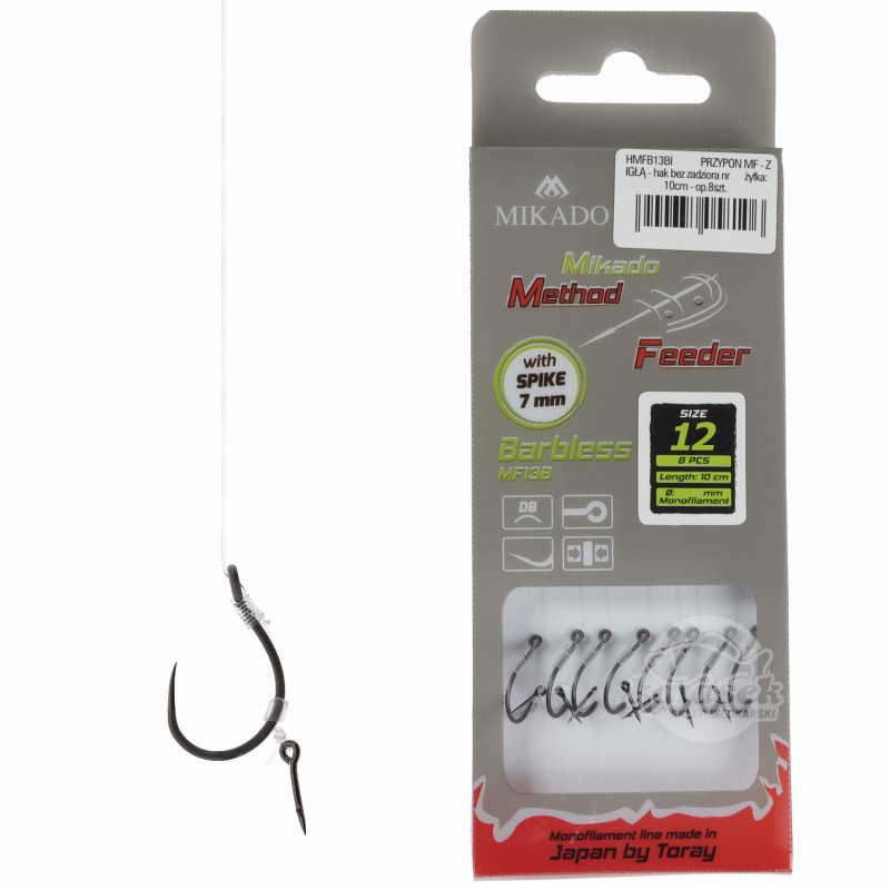 Bezzadziorowe haki MF13 zawiązane na przyponach do techniki Method Feeder. Często wymagane na łowiskach komercyjnych. Wykończone najwyższej klasy żyłką oraz igłą do montażu przynęty.