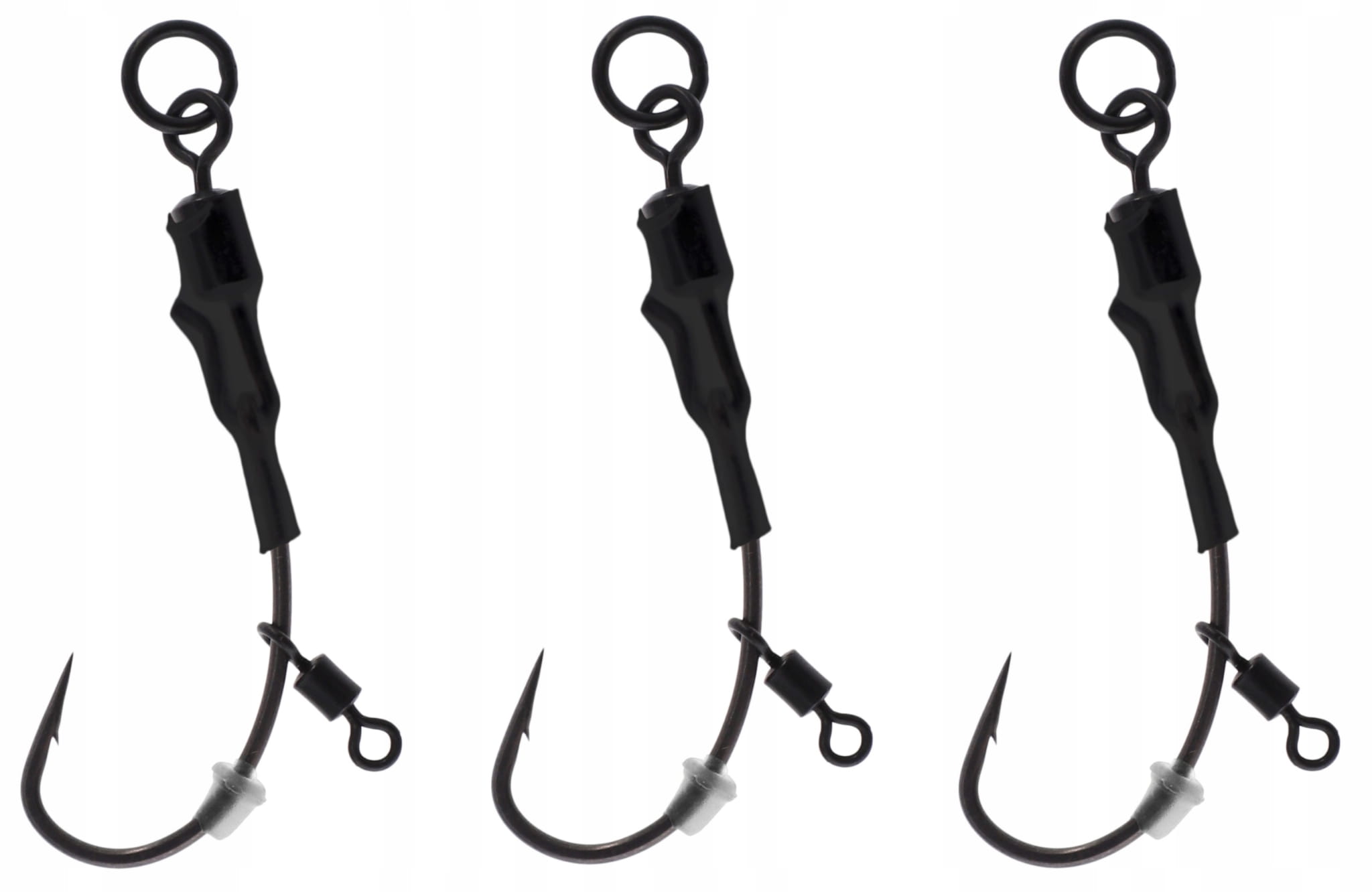 Gotowe zestawy Ronnie Rig do połowu na kulki pływające. Najwyższej jakości japońskie haczyk BKK zamocowany na krętliku z szybkozłączką zasłoniętym rurką termokurczliwą. Przynętę mocujemy do poruszającego się na trzonku mini krętlika.