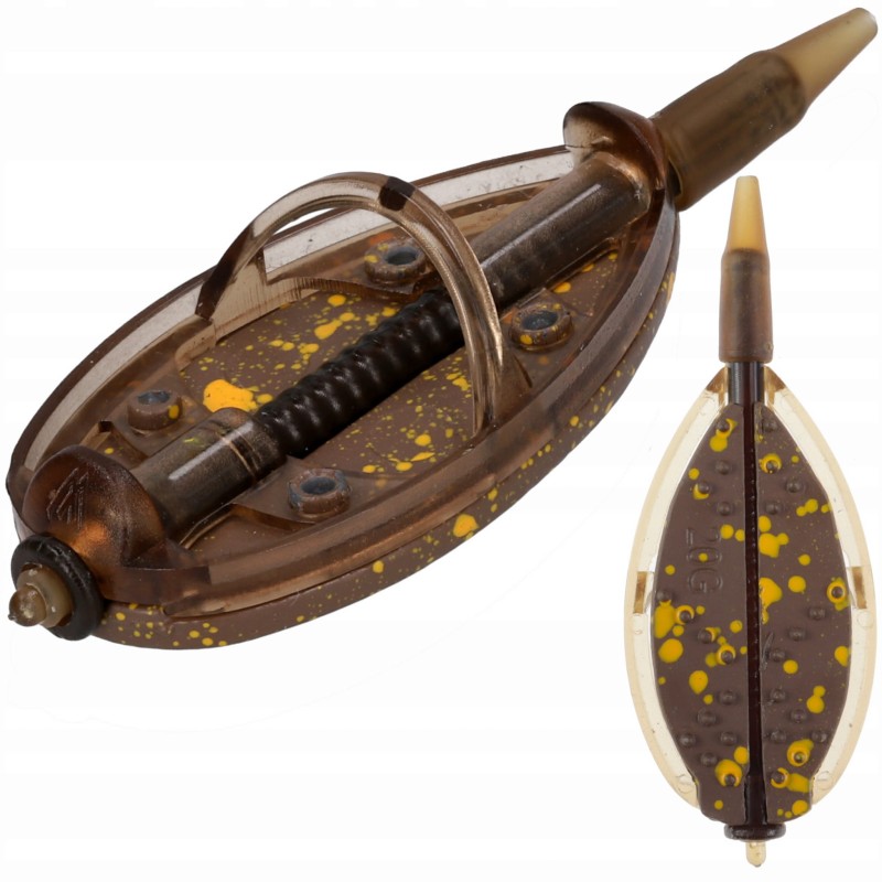 Q.M.F. to system pozwalający w szybki i łatwy sposób wymienić podajnik bez konieczności rozbrajania całego zestawu. Wystarczy zdjąć gumowy kapturek, zsunąć koszyk z trzpienia i zamienić go inną gramaturą.