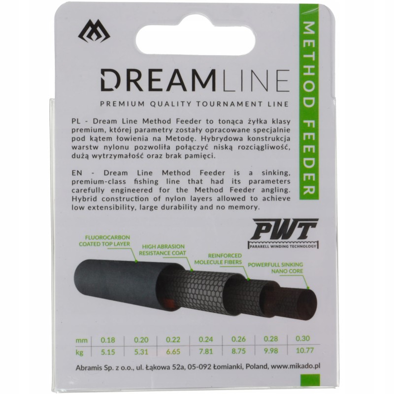Dream Line Method Feeder to tonąca żyłka klasy premium, której parametry zostały opracowane specjalnie pod kątem łowienia na metodę. Hybrydowa konstrukcja warstw nylonu pozwoliła połączyć zarówno niską rozciągliwość, dużą wytrzymałość oraz brak pamięci. Kamuflażowy kolor w odcieniach brązu idealne wtapia się w tło łowiska umożliwiając łowienie ostrożnych ryb (karpi, linów, amurów, karasi, dużych okazów leszczy itp.).