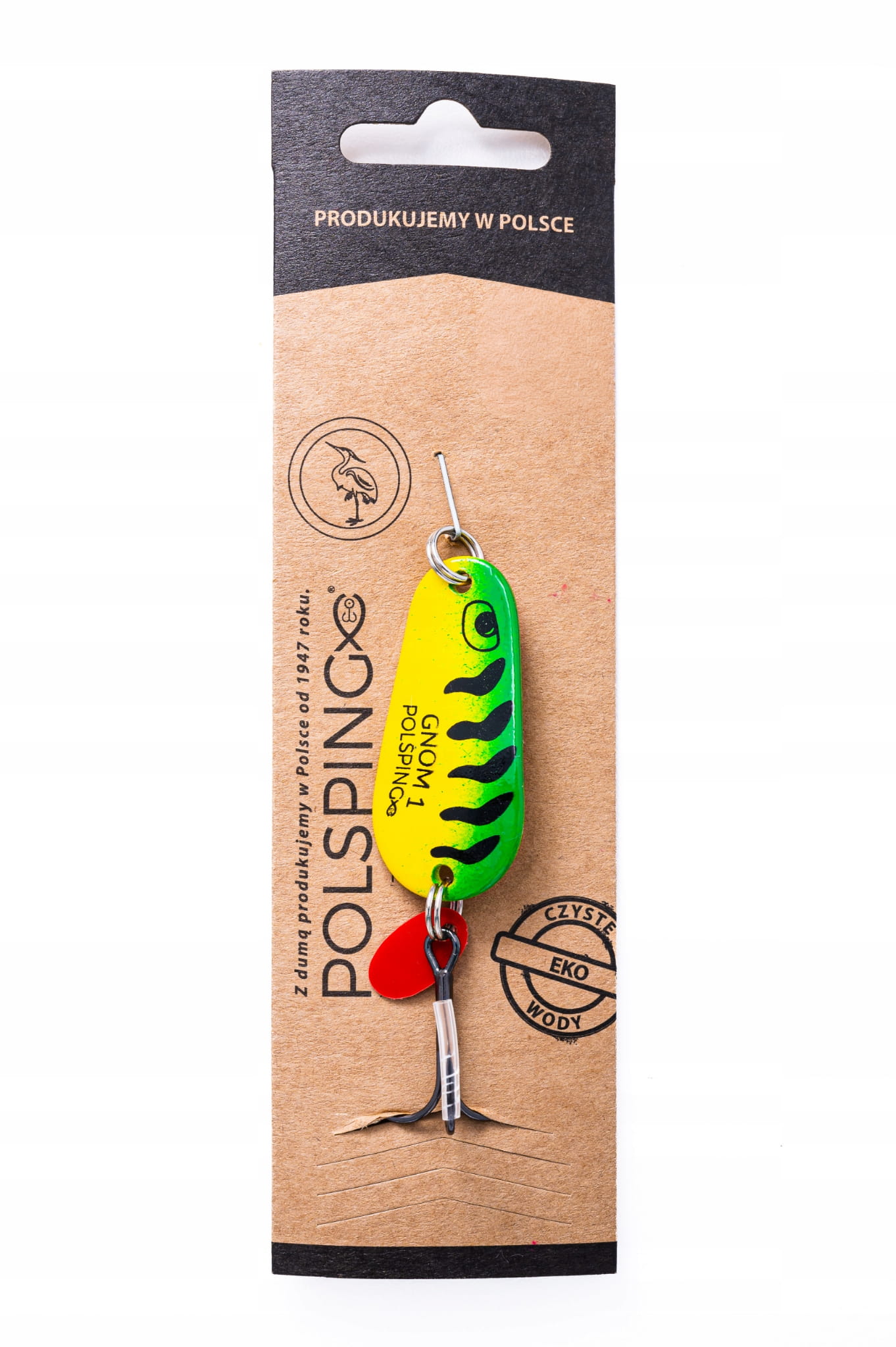 Klasyczna wahadłówka Polsping Gnom w efektownym kolorze Green Tiger to niezawodna przynęta na szczupaki, okonie i sandacze. Charakteryzuje się agresywną, migotliwą pracą, która skutecznie prowokuje drapieżniki nawet w chłodniejszej wodzie.