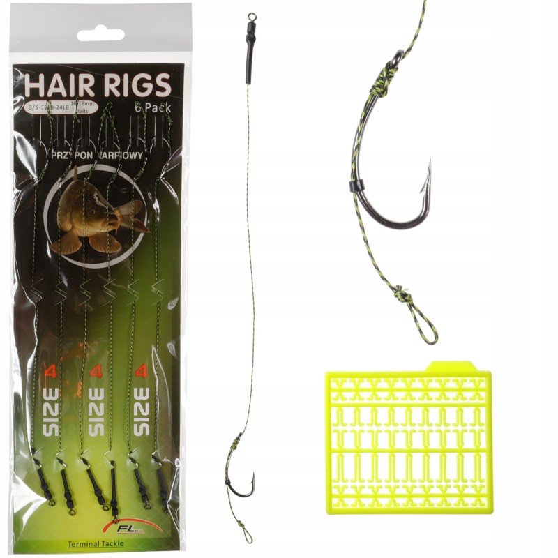 Zestaw 6 przyponów włosowych o długości ~21 cm. W skład zestawu wchodzą przypony z włosem o długości 16 - 18 mm. Dzięki zastosowaniu klasycznego haka karpiowego nie zachodzi potrzeba używania pozycjonera.