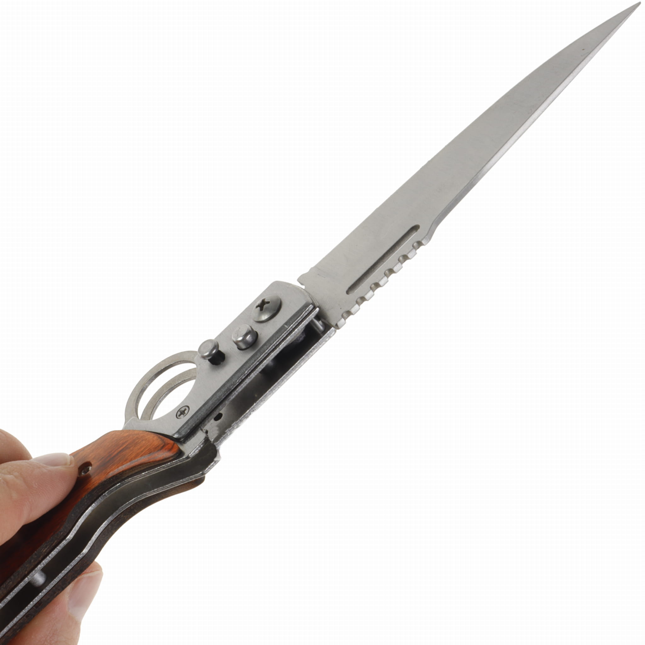 Ostry, solidnie wykonany nóż scyzoryk. Ostrze wykonane ze stali nierdzewnej.